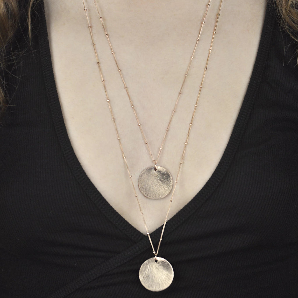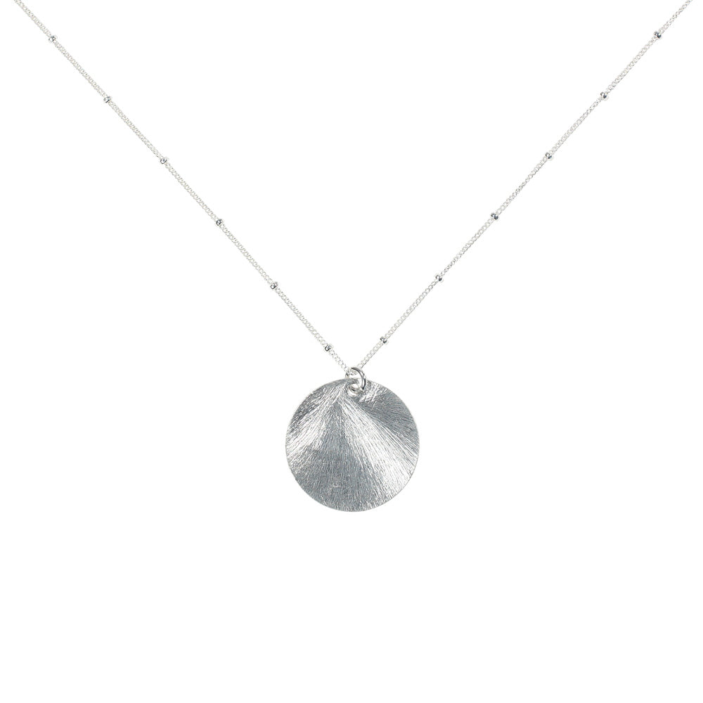 A great everyday necklace with a brushed textured disc on a ball chain. Available in 2 lengths.